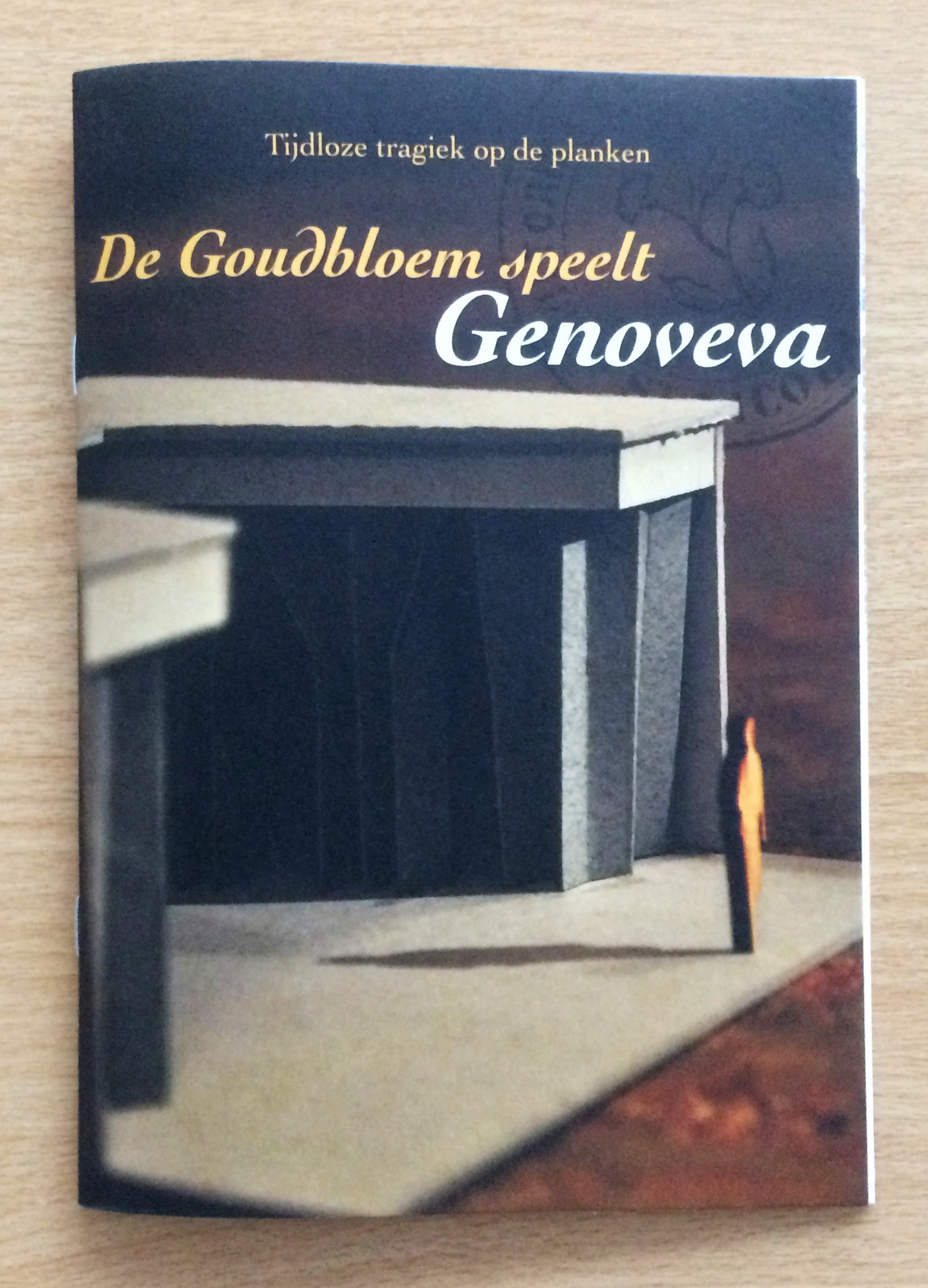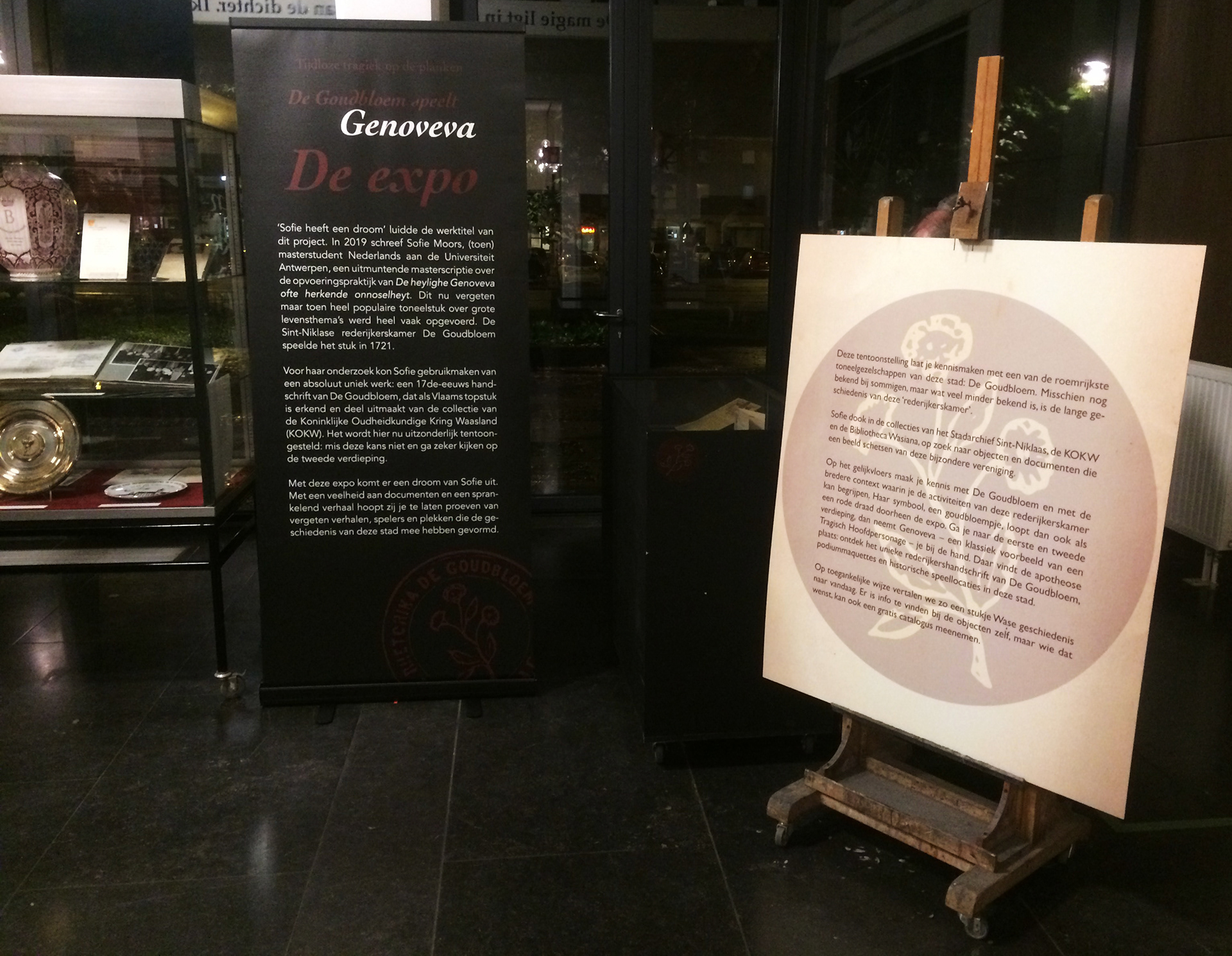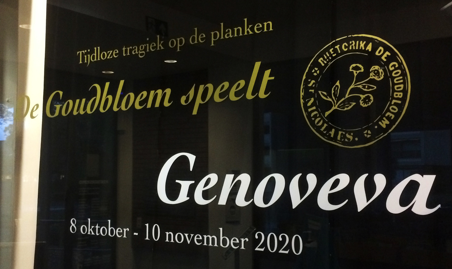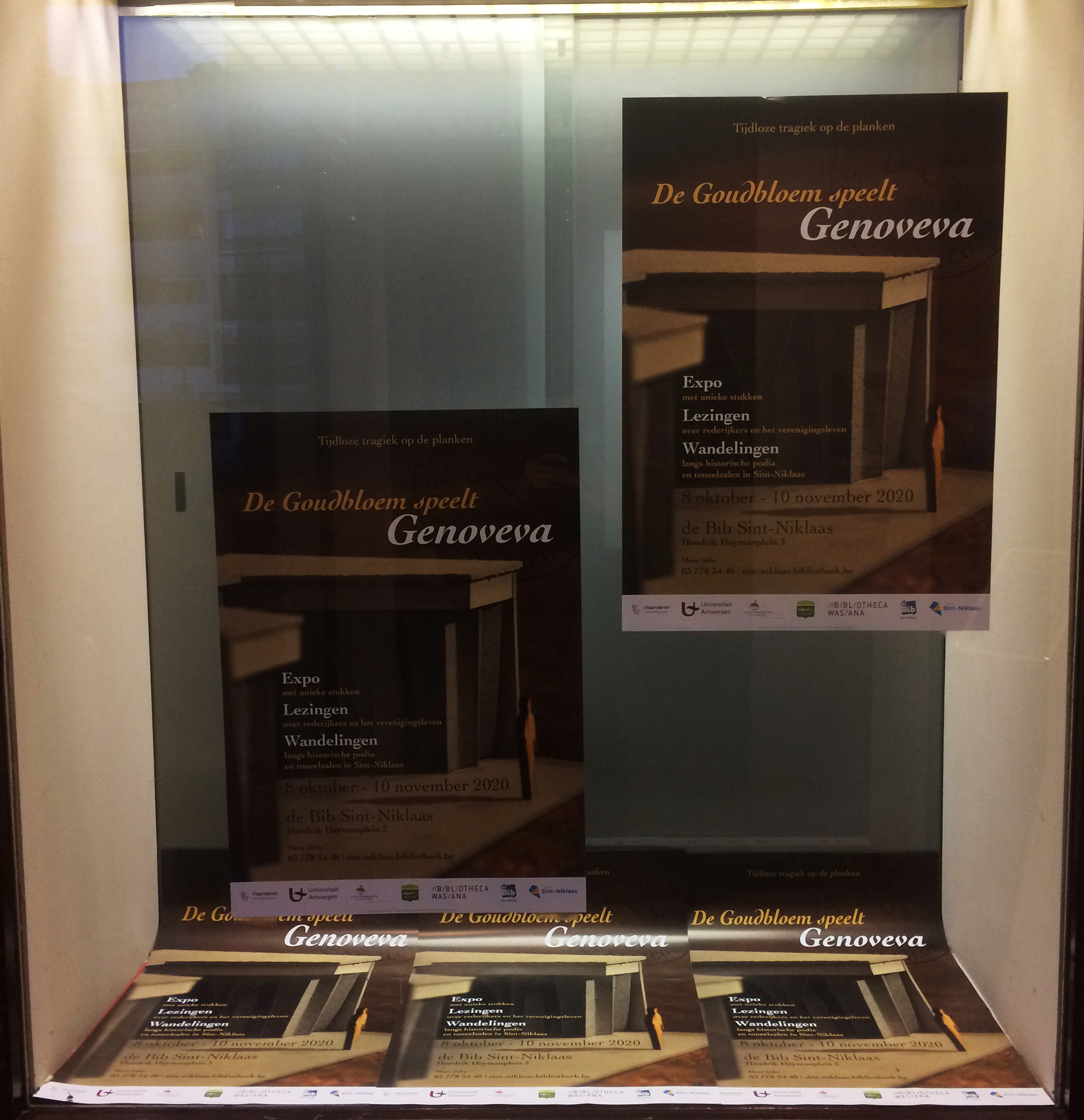 Assignment for Bibliotheca Wasiana. Layout work for expo 'Tijdloze tragiek op de planken - De Goudbloem speelt Genoveva': poster, information panels and banners, visitor's guide, window print, digital banners…