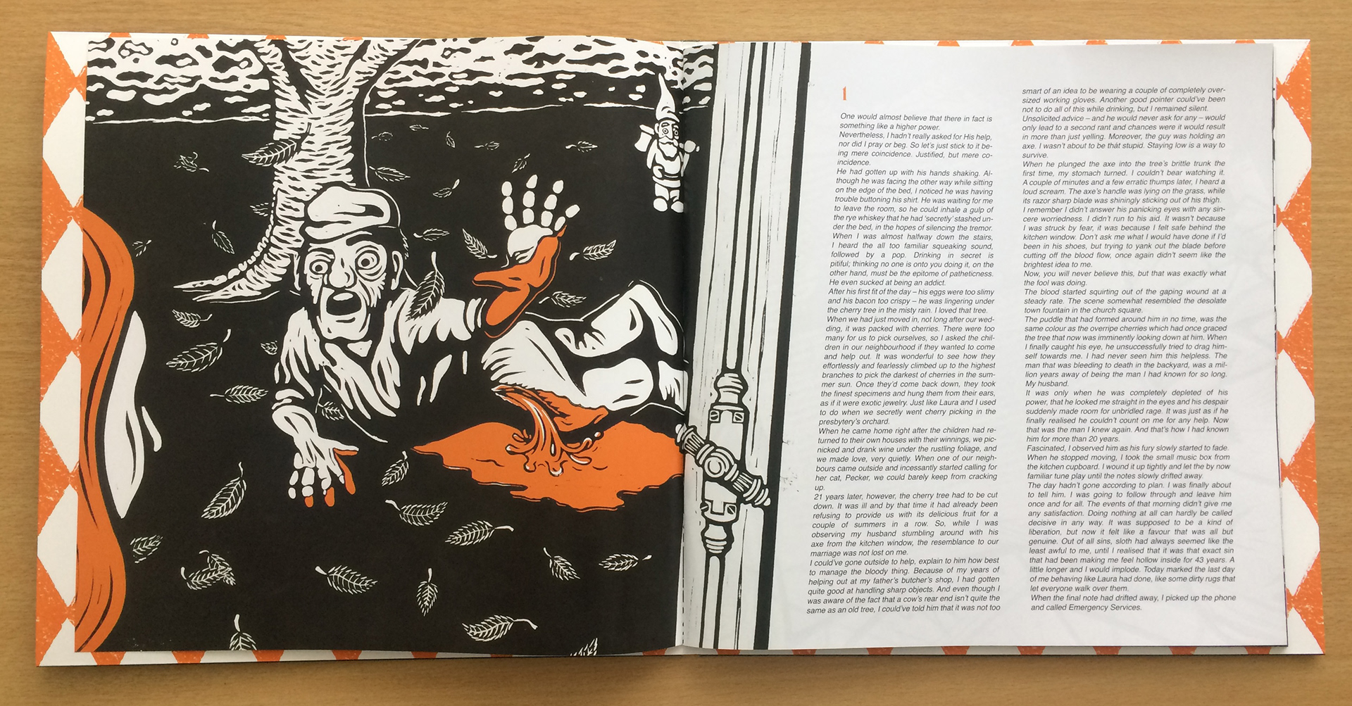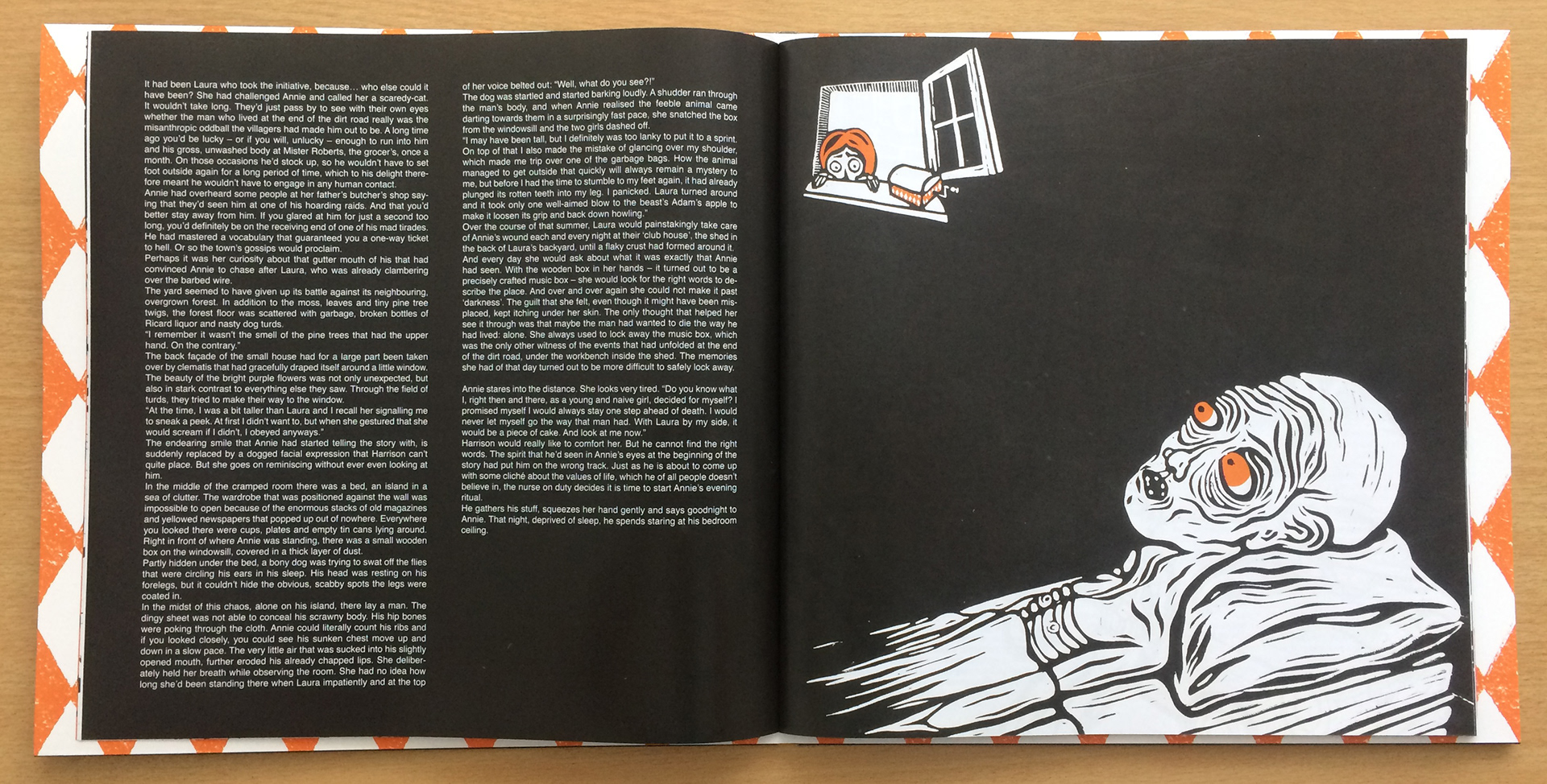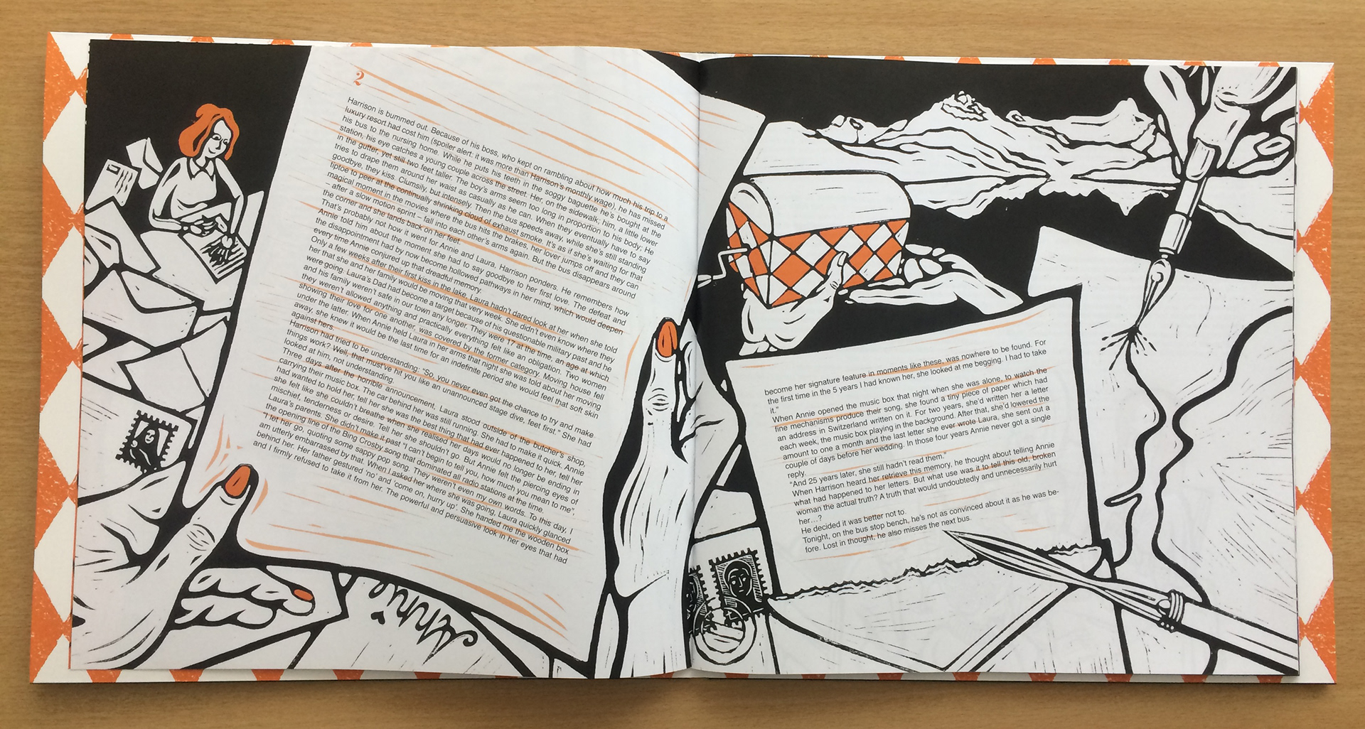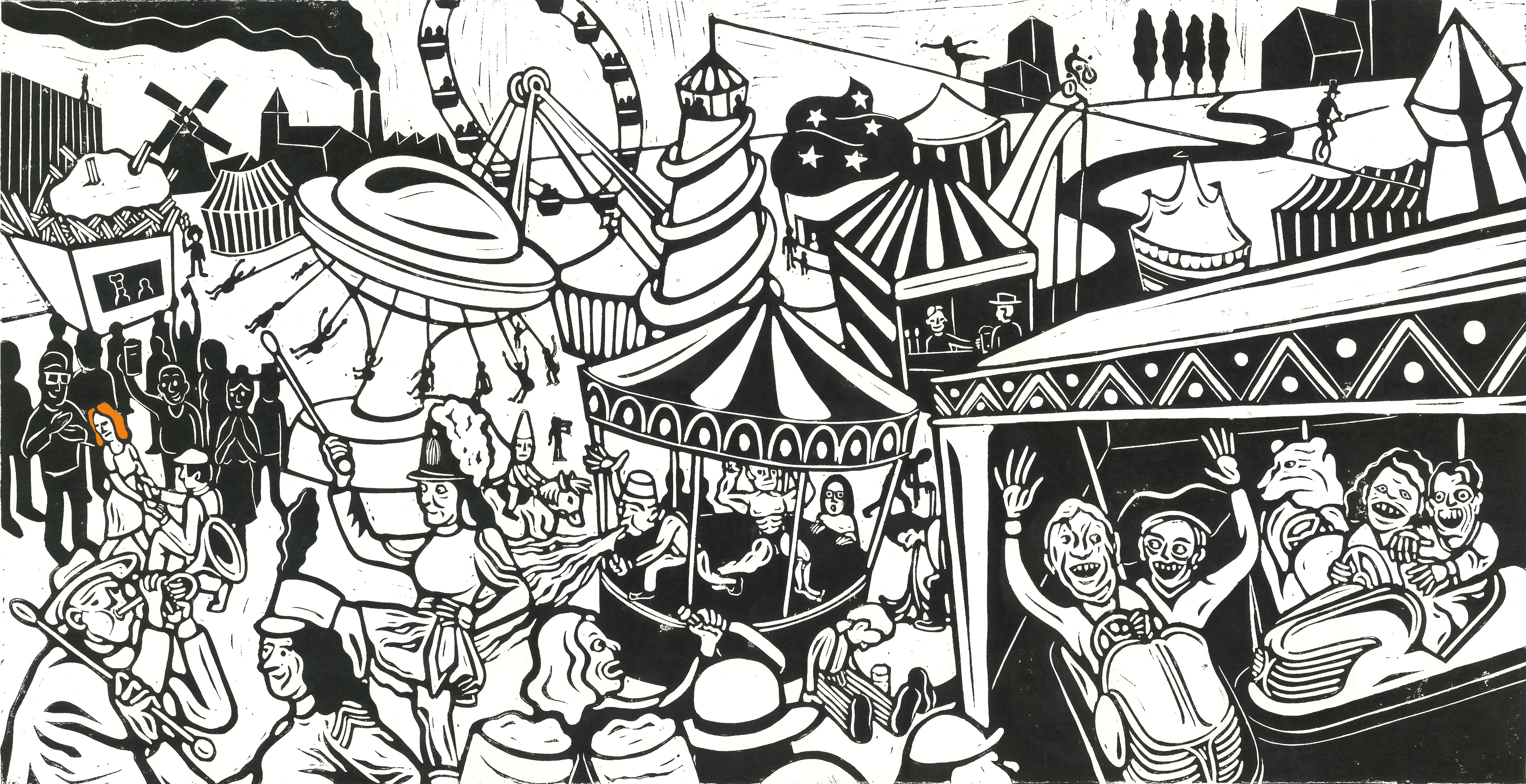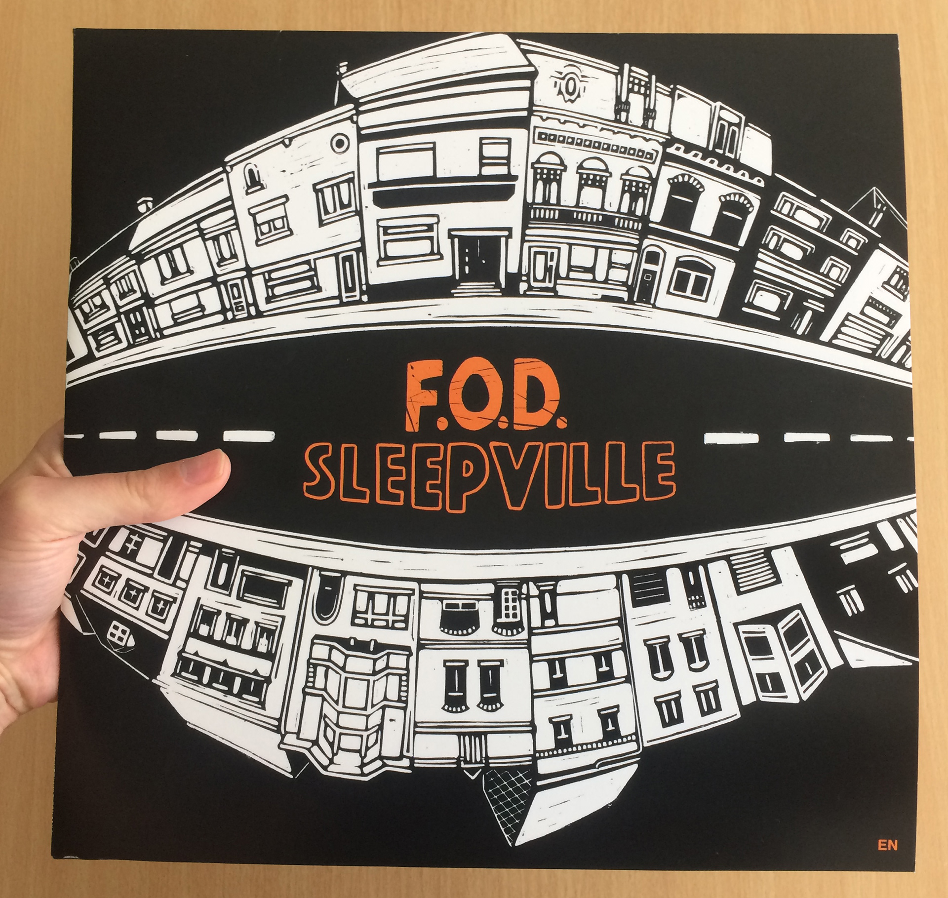 Artwork (illustrations & design) for F.O.D.'s concept album Sleepville and merchandising. All of these illustrations are lino prints.